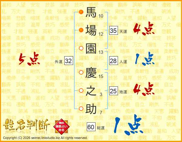 馬場園慶之助さんの地運は25画の4点!