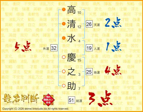 高(10画)清(12画)水(4画) 慶(15画)之(3画)助(7画)