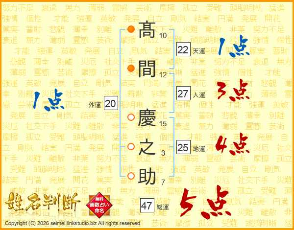 髙(10画)間(12画) 慶(15画)之(3画)助(7画)