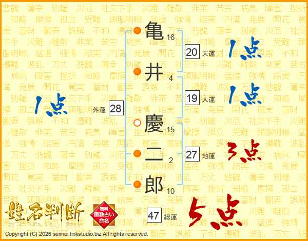 亀(16画)井(4画) 慶(15画)二(2画)郎(10画)