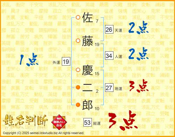 佐(7画)藤(19画) 慶(15画)二(2画)郎(10画)