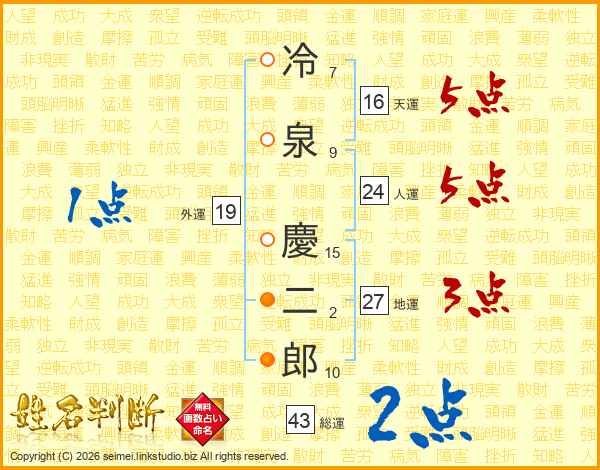 冷(7画)泉(9画) 慶(15画)二(2画)郎(10画)