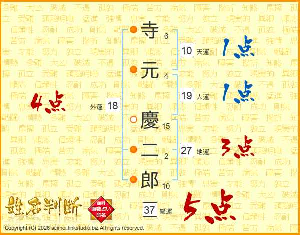 寺(6画)元(4画) 慶(15画)二(2画)郎(10画)