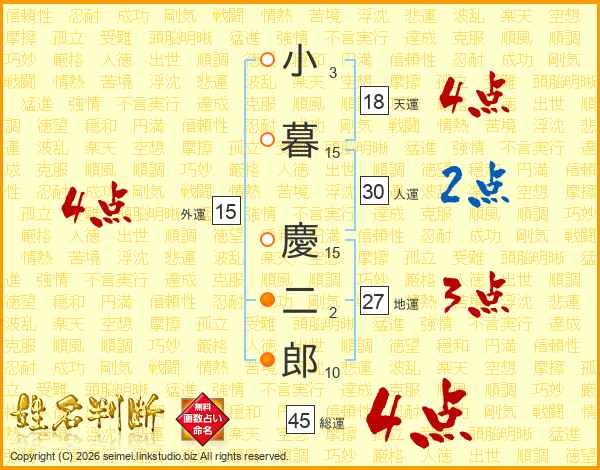 小(3画)暮(15画) 慶(15画)二(2画)郎(10画)