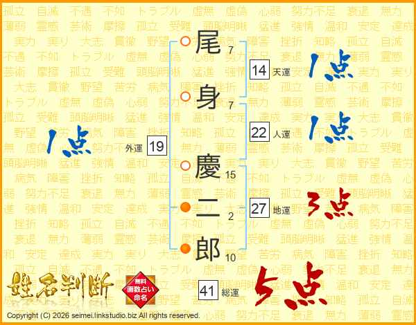 尾(7画)身(7画) 慶(15画)二(2画)郎(10画)