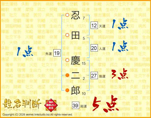 忍田慶二郎さんの総運は39画の5点!