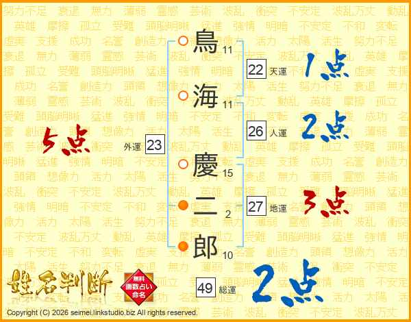 鳥海慶二郎さんの総運は49画の2点!