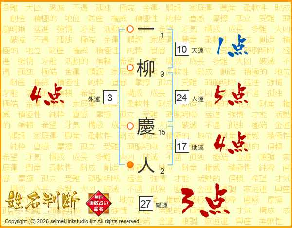 一(1画)柳(9画) 慶(15画)人(2画)