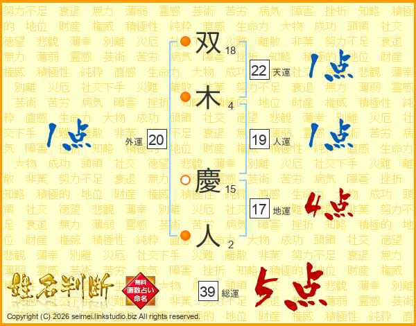 双木慶人さんの総運は39画の5点!