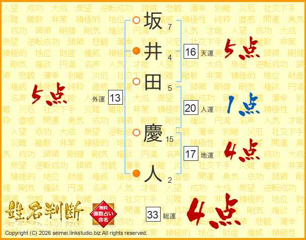 坂(7画)井(4画)田(5画) 慶(15画)人(2画)