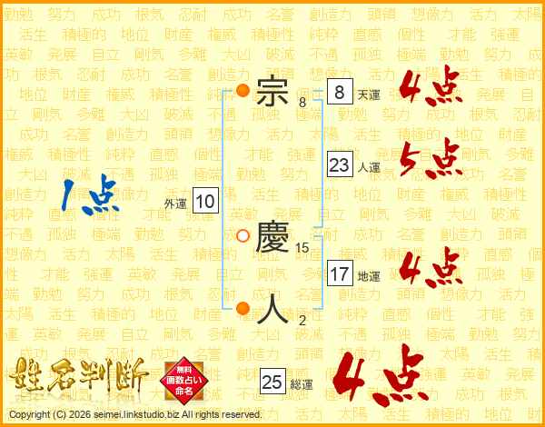 生活面を象徴する運勢です。外部から受ける影響力を表し、結婚運、家庭運や職場、環境への順応性を表します。総運から人運を引いた画数。姓や名が1文字の場合を除く。