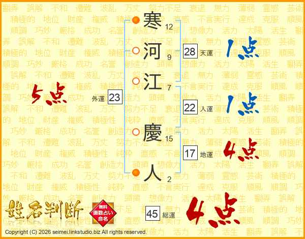 寒(12画)河(9画)江(7画) 慶(15画)人(2画)