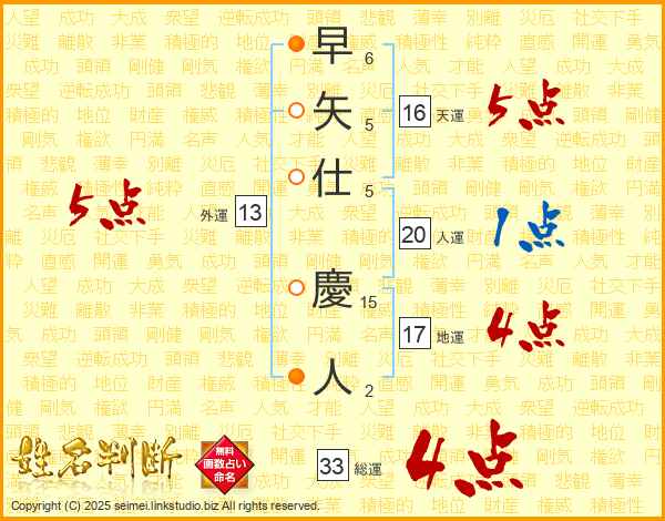 早矢仕慶人さんの総運は33画の4点!