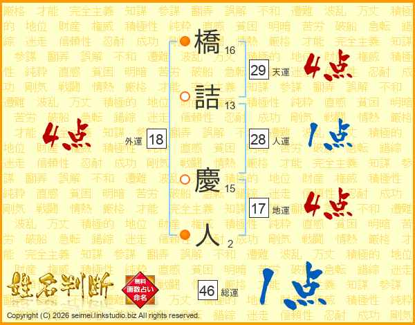 橋(16画)詰(13画) 慶(15画)人(2画)