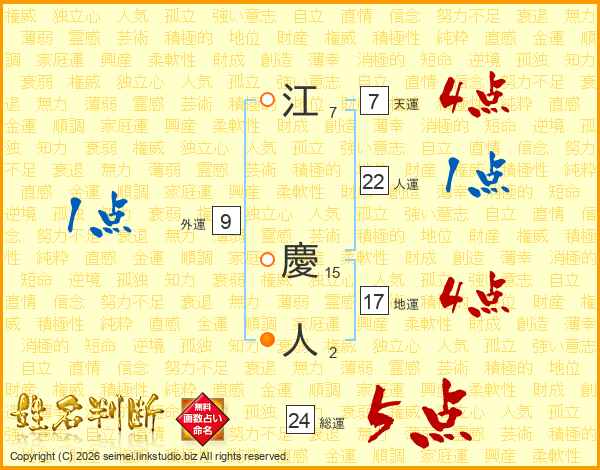 生活面を象徴する運勢です。外部から受ける影響力を表し、結婚運、家庭運や職場、環境への順応性を表します。総運から人運を引いた画数。姓や名が1文字の場合を除く。