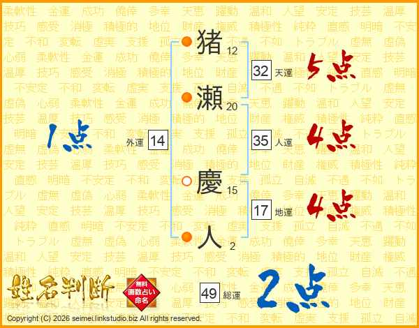 猪(12画)瀬(20画) 慶(15画)人(2画)