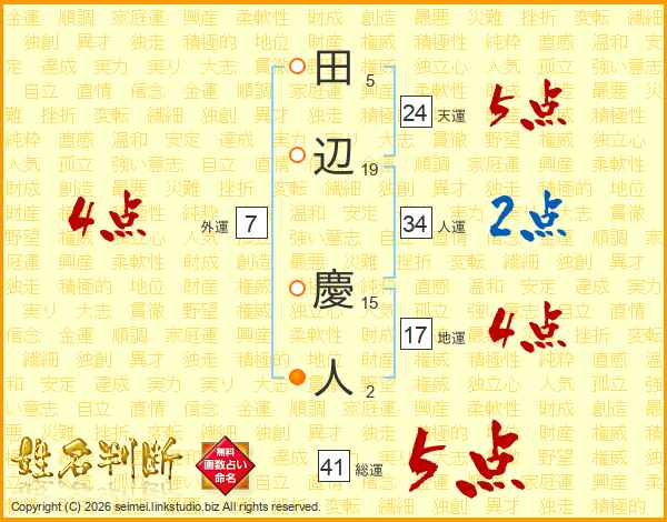 生活面を象徴する運勢です。外部から受ける影響力を表し、結婚運、家庭運や職場、環境への順応性を表します。総運から人運を引いた画数。姓や名が1文字の場合を除く。