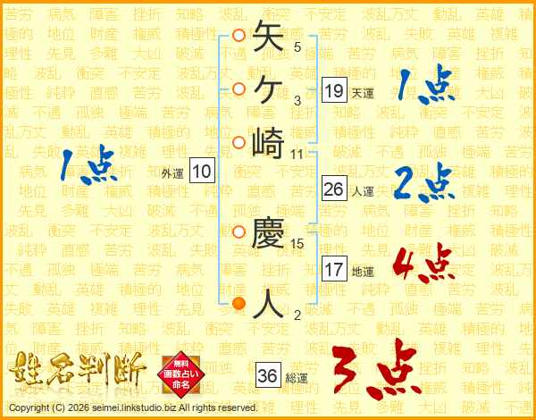 矢(5画)ケ(3画)崎(11画) 慶(15画)人(2画)