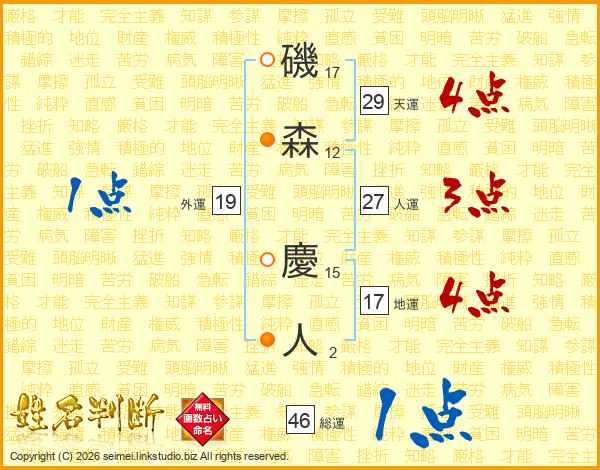生活面を象徴する運勢です。外部から受ける影響力を表し、結婚運、家庭運や職場、環境への順応性を表します。総運から人運を引いた画数。姓や名が1文字の場合を除く。