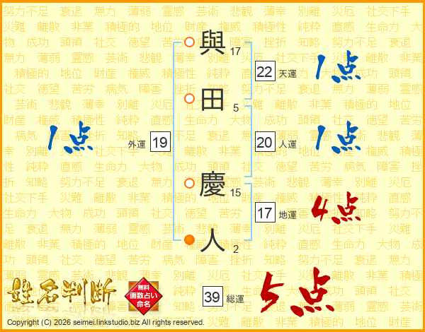 生活面を象徴する運勢です。外部から受ける影響力を表し、結婚運、家庭運や職場、環境への順応性を表します。総運から人運を引いた画数。姓や名が1文字の場合を除く。