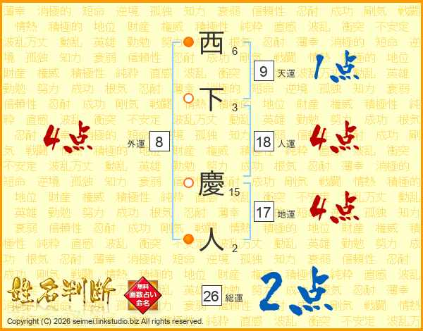 生活面を象徴する運勢です。外部から受ける影響力を表し、結婚運、家庭運や職場、環境への順応性を表します。総運から人運を引いた画数。姓や名が1文字の場合を除く。