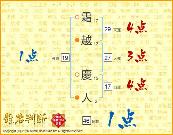 生活面を象徴する運勢です。外部から受ける影響力を表し、結婚運、家庭運や職場、環境への順応性を表します。総運から人運を引いた画数。姓や名が1文字の場合を除く。