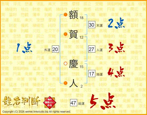 あなたの人生を表す1番重要な運勢です。生涯を通じて影響する総合運となり、主に50歳以降の晩年期に影響を及ぼします。苗字と名前の合計画数。