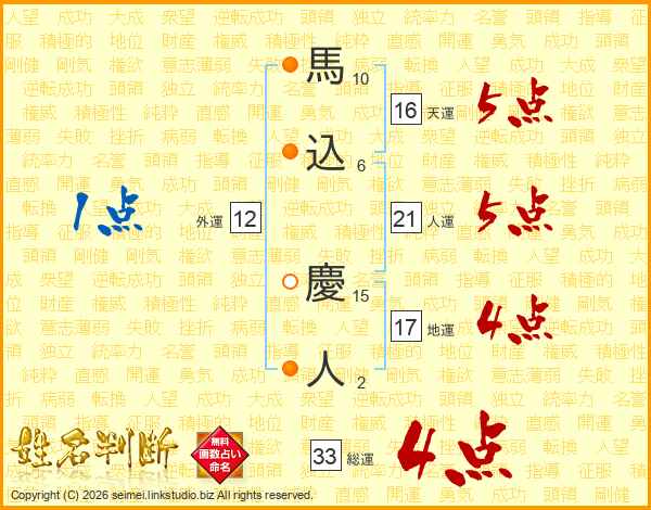 馬込慶人さんの総運は33画の4点!
