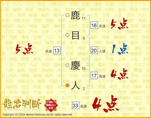 鹿目慶人さんの総運は33画の4点!