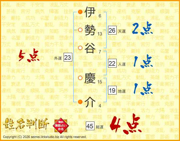 伊(6画)勢(13画)谷(7画) 慶(15画)介(4画)