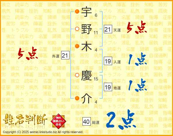 宇(6画)野(11画)木(4画) 慶(15画)介(4画)