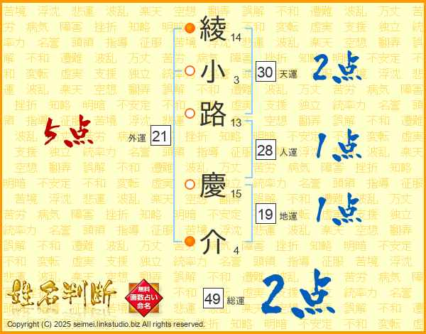 綾(14画)小(3画)路(13画) 慶(15画)介(4画)