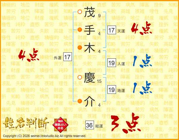 茂(9画)手(4画)木(4画) 慶(15画)介(4画)