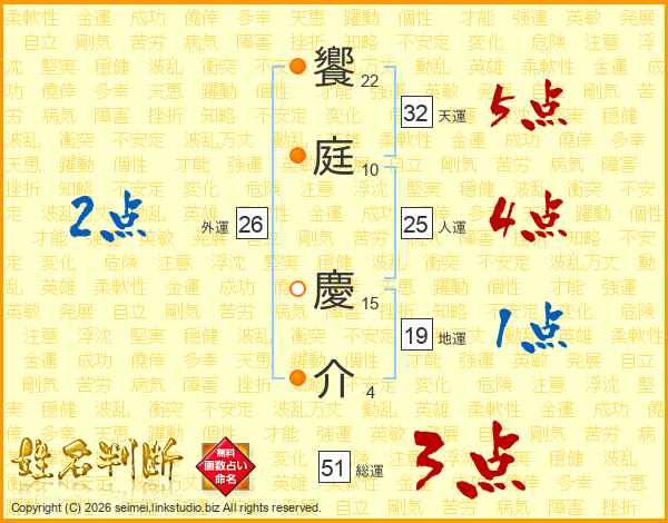 饗(22画)庭(10画) 慶(15画)介(4画)
