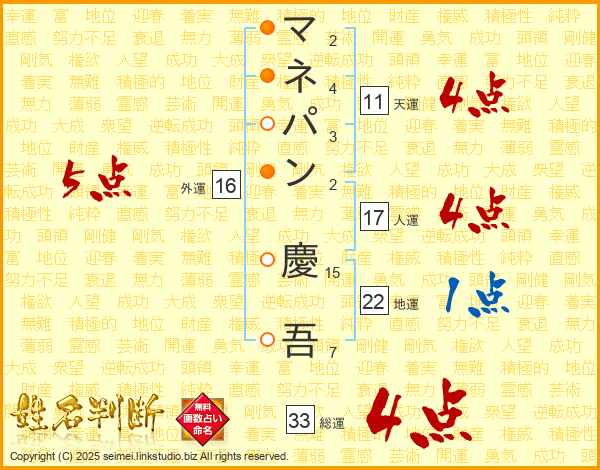 マ(2画)ネ(4画)パ(3画)ン(2画) 慶(15画)吾(7画)