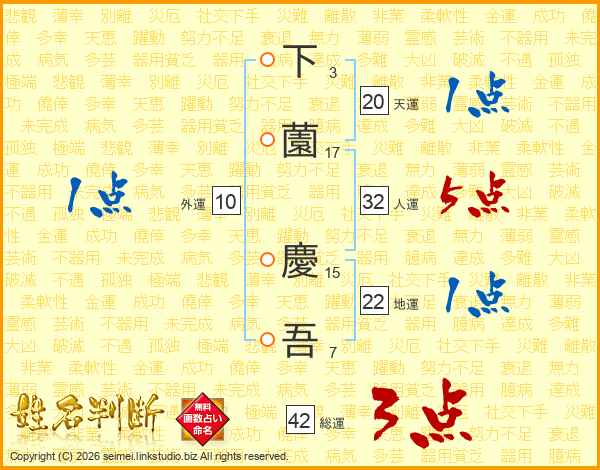 下(3画)薗(17画) 慶(15画)吾(7画)