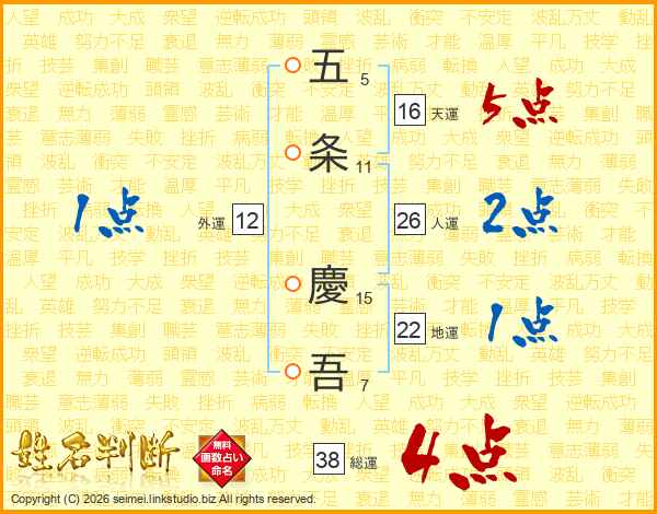 あなたの人生を表す1番重要な運勢です。生涯を通じて影響する総合運となり、主に50歳以降の晩年期に影響を及ぼします。苗字と名前の合計画数。