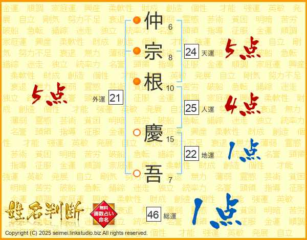 仲(6画)宗(8画)根(10画) 慶(15画)吾(7画)