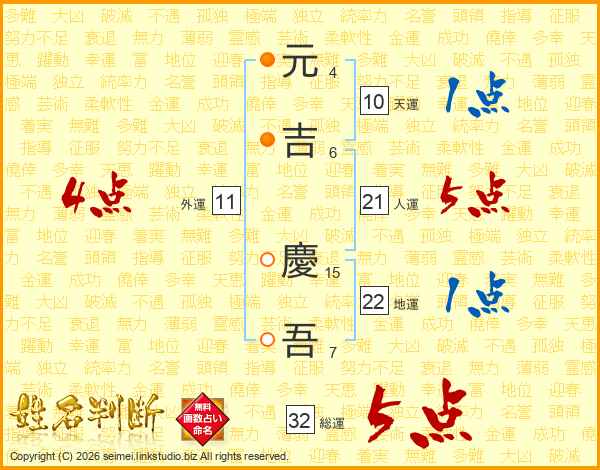 元(4画)吉(6画) 慶(15画)吾(7画)