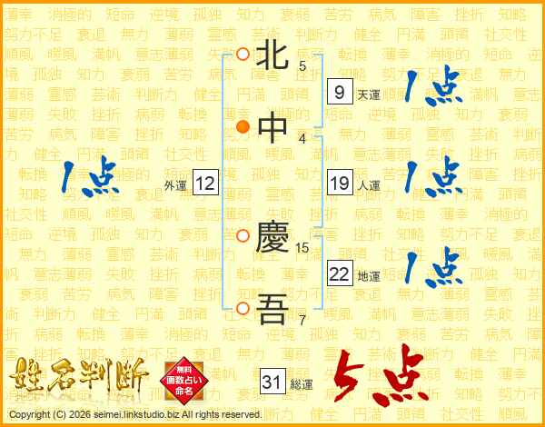 北(5画)中(4画) 慶(15画)吾(7画)