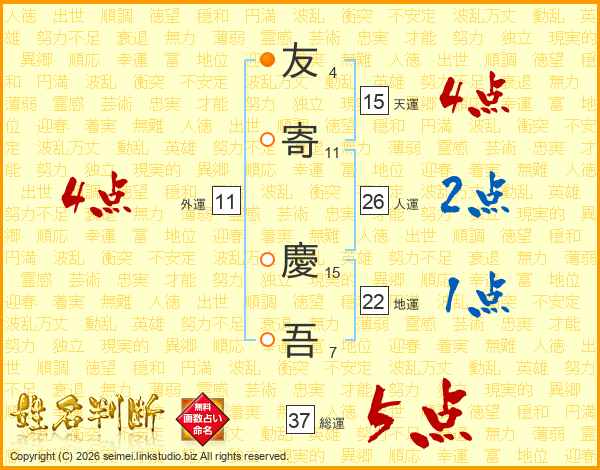 友(4画)寄(11画) 慶(15画)吾(7画)