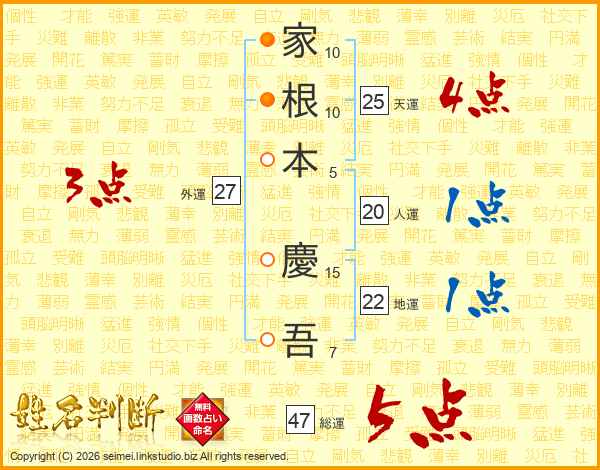家(10画)根(10画)本(5画) 慶(15画)吾(7画)