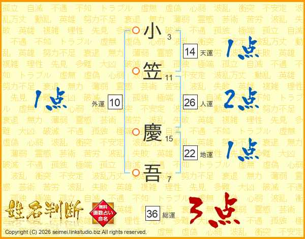 小(3画)笠(11画) 慶(15画)吾(7画)