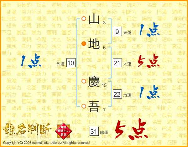 山(3画)地(6画) 慶(15画)吾(7画)