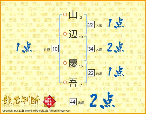 山(3画)辺(19画) 慶(15画)吾(7画)