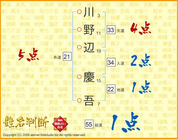 川(3画)野(11画)辺(19画) 慶(15画)吾(7画)