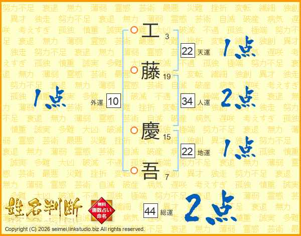 工(3画)藤(19画) 慶(15画)吾(7画)