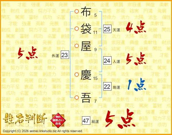 布(5画)袋(11画)屋(9画) 慶(15画)吾(7画)