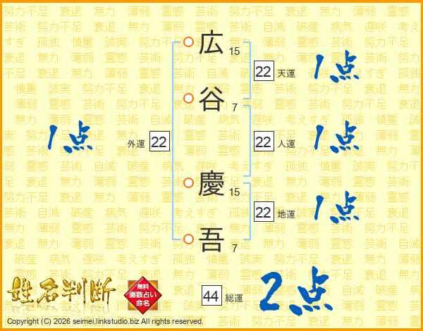 広(15画)谷(7画) 慶(15画)吾(7画)