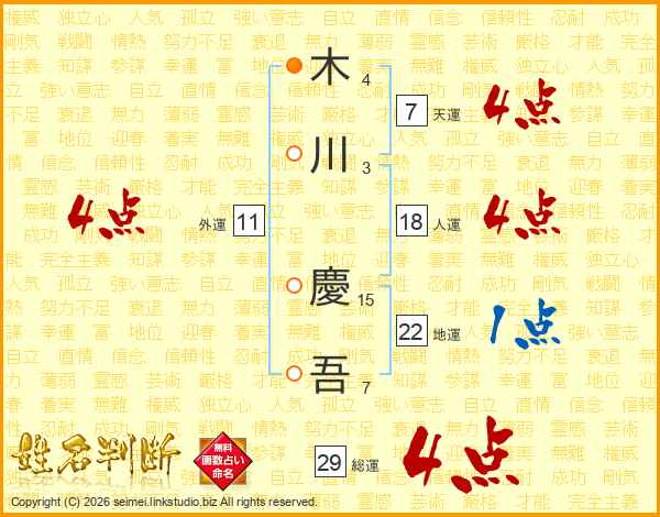 木(4画)川(3画) 慶(15画)吾(7画)